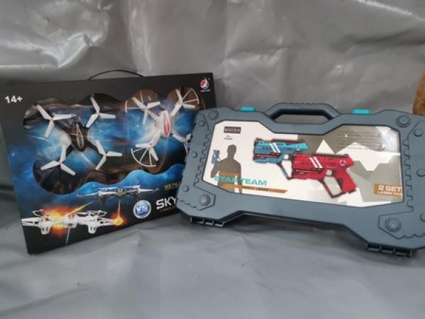 Laser battle sæt m. 2 pistoler – en rød og en blå. Pistolerne har indikator for antal liv, valg af team, lys osv. 2 stk. v-max Sky Fighter 6.Axis Gyro Quadcopter droner. HX762 X2 Player Combat Box. En sort og en hvid. 2.4 GHz. Vind- og modstandsdygtig. Holdbart materiale. Ubrugt og i original emballage. + MOMS