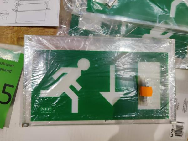 Står i 6650 Brørup. Udgangsskilte, 5 stk. I piktogram plexiglas. Med beslag. Måler: 30 x 18 cm. Uden lyskilde. Ubrugte. Oprydning fra EL-Grosist + MOMS