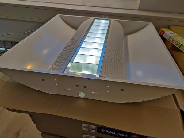 Står i 6650 Brørup. Loftpanel, 2 stk. Med 40W lyskilde. Osram indside. Måler: 60 x 60 cm. D:10 cm. Ubrugt. Oprydning fra EL-Grosist + MOMS