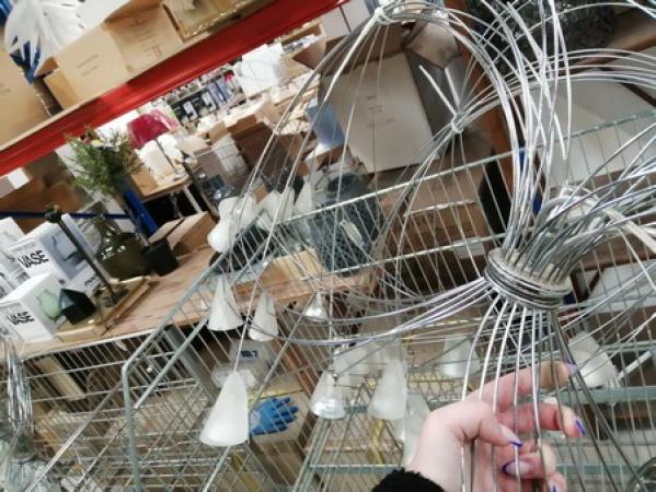 Bach lysekronen er designet af Solzi Luce og fremstillet af Hampstead Lightning i Italien. Hver halogenpære er dækket af en mat hvid polycarbonatskærm. Mål: Højde: 91,4 cm og Diameter: 162,6 cm. Nogle af pærerne skal eventuelt udskiftes. Når lysekronen hænger, må stængerne ikke røre hinanden, da den kan kortslutte. Materialer: Polycarbonat og metal. Der er faldet 3 skærme af, som ligger ved siden af. Brugt. + MOMS