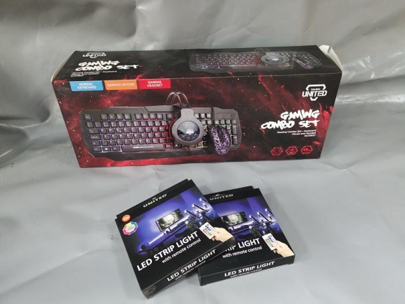 Perfekt sæt til gamerbordet bestående af et gaming sæt med keyboard, mus og headset og 2 stk. LED strip light 1 meter. Keyboard er Nordisk (DK/SE/NO/FI). LED strip light er med fjernbetjening, hvormed der kan skiftes farver. Til USB. Fra United. Ubrugt og i original emballage. +MOMS