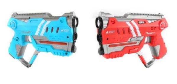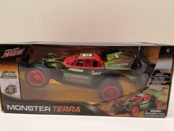 Slip dit barns fantasi løs ved at lade dem lege med Kool Speeds fjernstyrede Monster Terra Buggy. Bilen har tykke udendørs dæk designet til ujævnt terræn. Den kan bevæge sig fremad, bagud, til venstre og højre ved et tryk på fjernbetjeningen. Bilen har en off-road styrtbøjle, en aerodynamisk halevinge, gummigreb og måler omkring 26 cm i længden. Laser battle sæt m. 2 pistoler – en rød og en blå. Pistolerne har indikator for antal liv, valg af team, lys osv. Ubrugt og i original emballage. + MOMS