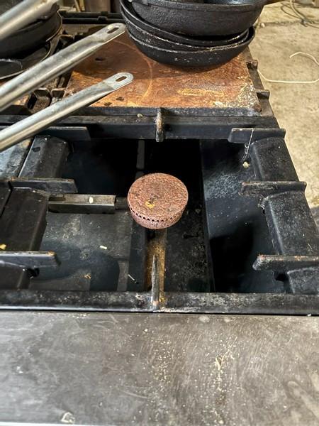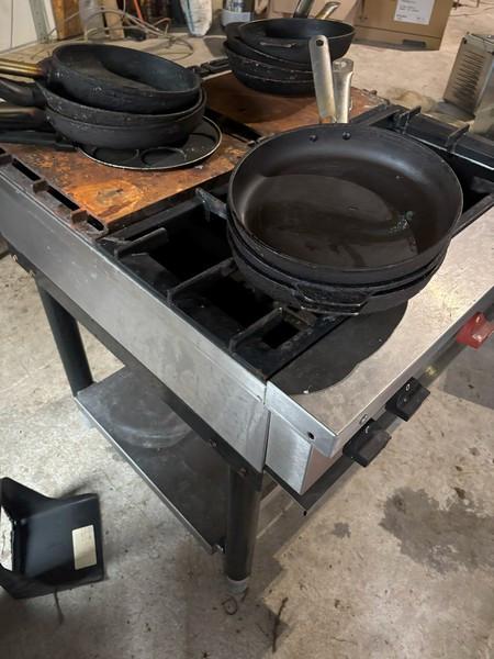 Zanussi gas komfur med 4 blus. Der medfølger 10 stk. ældre pander. Fungerede ved nedtagning, men pt. ikke afprøvet. En slange sidder løst under, så skal gennemgåes og serviceres før opstart.Trænger til rengøring. Brugt, oprydning fra restaurant. MOMSFRI