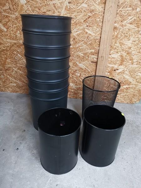 10 stk. skralde/opbevaringsspande. 1 stk. regulær skraldespand i metal flet, mål H37xØ29 cm. 7 stk. høje metal spande, mål H37xØ25 cm. velegnet til opbevaring af f.eks. foder, legetøj, redskaber m.m. Samt 2 mindre metal spande, mål H30xØ25 cm. Alle brugte, men i fin stand. MOMSFRI