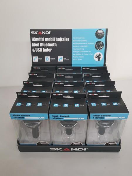12 stk. håndfri Bluetooth højtaler med USB opladerstik i fin udstillingsopbevaring fra Skandi Danmark. Besvar og afslut knap, justerbar lydstyrke. Med Bluetooth indikator. 60 gr. rotation. Ubrugte og i original emballage. +MOMS