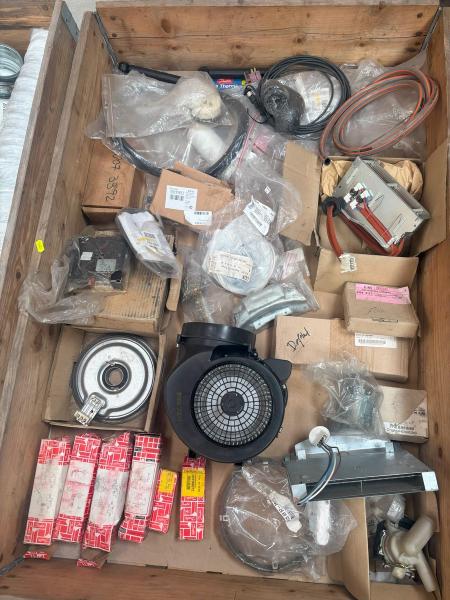 Parti reservedele til hvidevarer, m.m. 7 paller med diverse reservedele dele. Heriblandt: Termostater til køleanlæg, filter, måler, m.m. Mange dele. Oprydnings salg – MOMSFRI